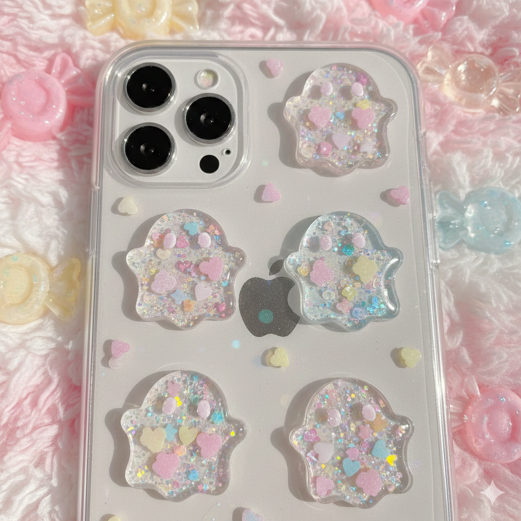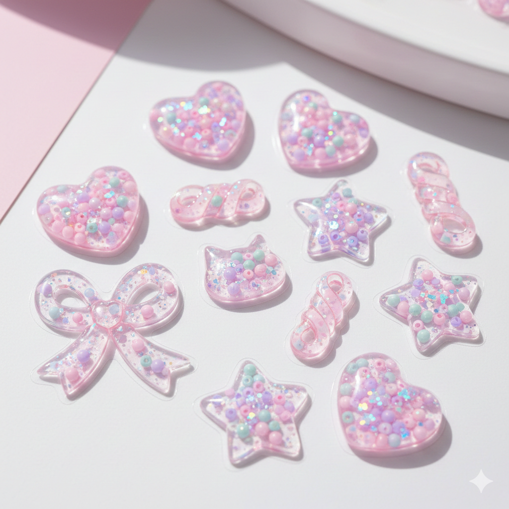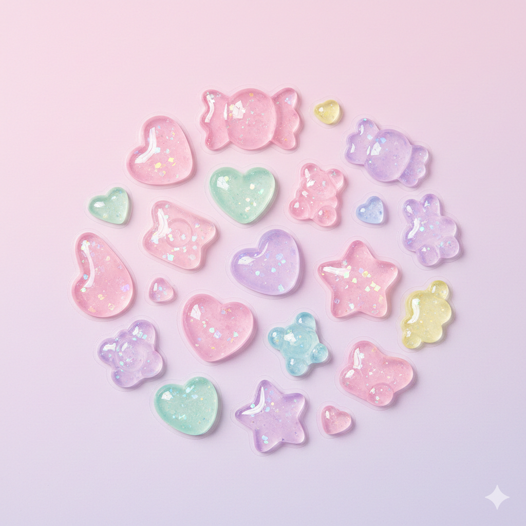 まるで本物のキャンディやおはじきを閉じ込めたような、透明感のあるエポキシ樹脂コーティングが施されています。光に当たるとキラキラ反射し、手帳やスマホを一気に華やかにしてくれます。