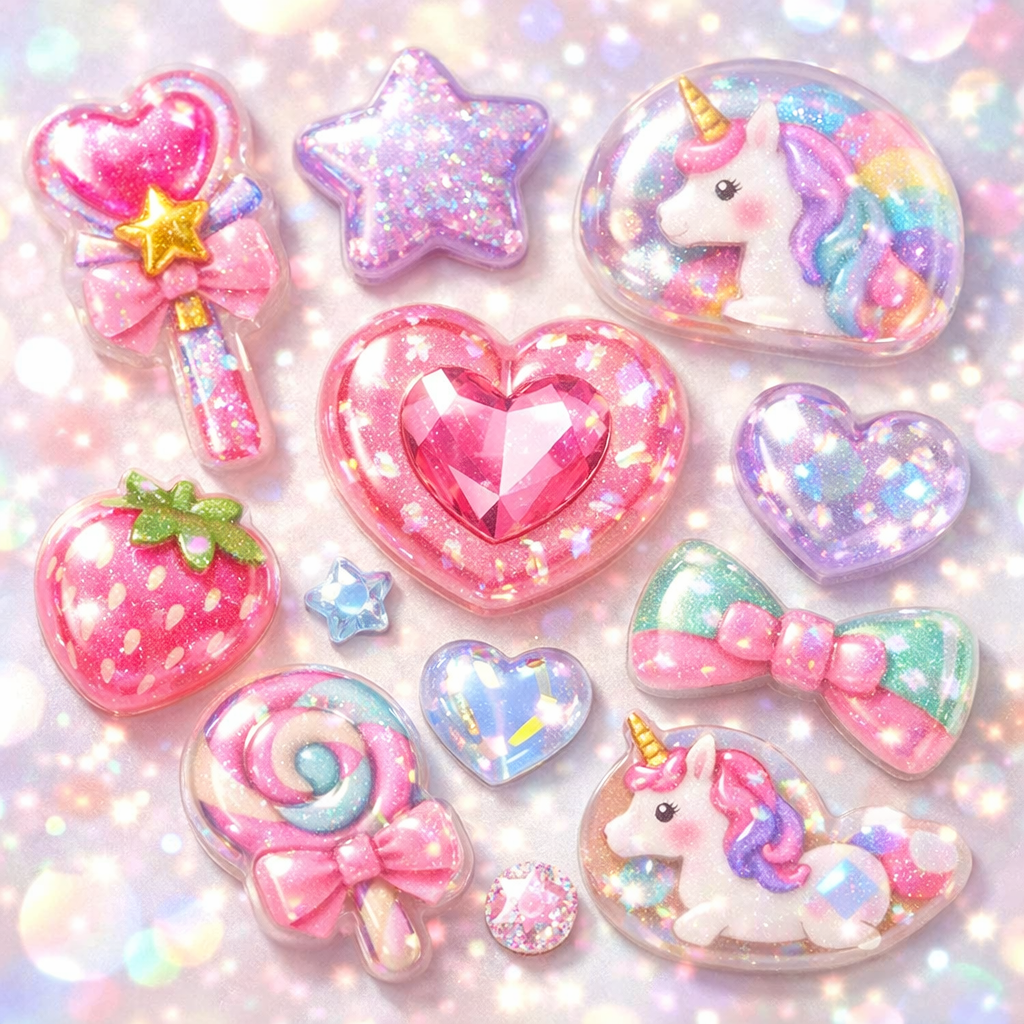 まるで本物のキャンディやおはじきを閉じ込めたような、透明感のあるエポキシ樹脂コーティングが施されています。光に当たるとキラキラ反射し、手帳やスマホを一気に華やかにしてくれます。
